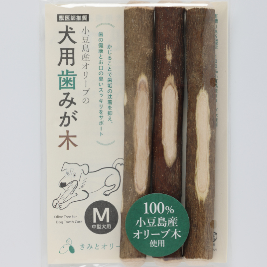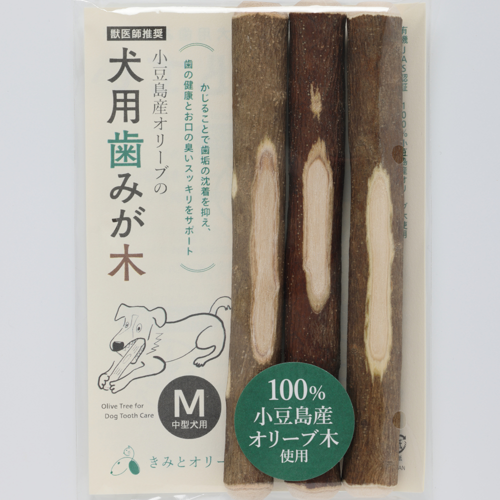 有機JAS 認証の畑で育てた小豆島産100%オリーブ木を使用した犬用歯みが木。かじることで歯垢の沈着を抑え、わんちゃんの歯の健康とお口の臭いスッキリをサポートします。