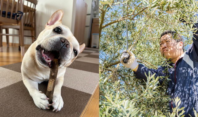 オリーブの木をそのまま使用しているため、おうちの中でもわんちゃんが自然を感じることができます。犬の口の中を傷つけないように丁寧に木の端を研磨し、徹底した殺菌洗浄を行なうため、飼い主も安心して与えることができる手作りの商品です。オリーブの木は硬く、噛んだあとに出る木くずが細かいため、ささくれにくい点もわんちゃんにとって安全です。