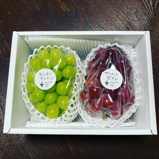 晴れの国である岡山県を代表する果物、それがシャインマスカットです。小田郡矢掛町で育てたシャインマスカットと上品な香りと甘みが特徴的なマスカットビオレの2房入りのセットです。甘さと食べ応えを追求して作ったシャインマスカットと風味が特徴的なマスカットビオレを食べて、その美味しさをぜひ食べ比べてください。
