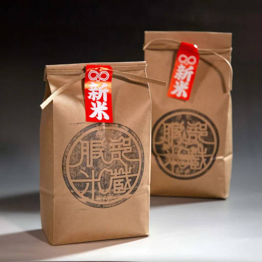 クラフト米袋に一つ一つ手作業で丁寧に詰めています。