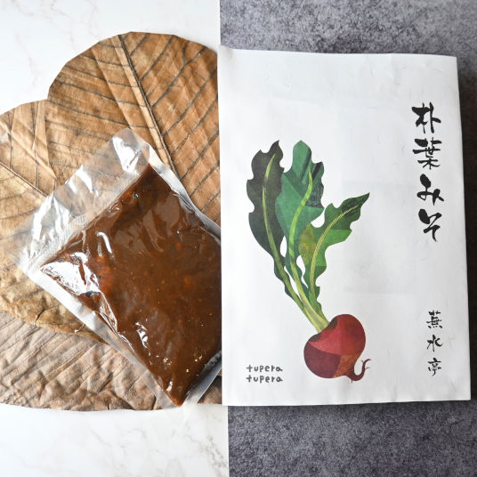 今や飛騨の名物でもある朴葉味噌は、元々飛騨の家庭料理であった焼き味噌を「飛騨の名物にしよう!」と朴葉にのせて、旅の人にお出ししたのが、昭和29年蕪水亭の2代目女将。今も代々の女将が手作りで味を伝承しています。パッケージは、絵本作家tupera tuperaさんのオリジナルデザインです。