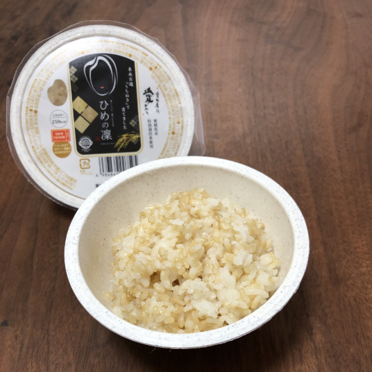 愛媛のブランド米「ひめの凜」、栄養価の高い玄米を50%ミックスしました。電子レンジで1分30秒。お茶碗型の容器でそのまま手軽に食べられます。常温保存OKかつ賞味期間が長いので、いざという時の備えにもおすすめです。