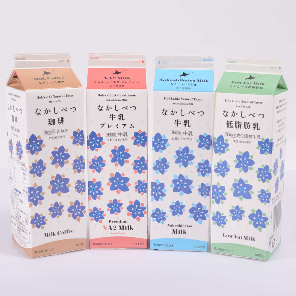 なかしべつの牛乳4種類の飲み比べセットです。3種類の牛乳とコーヒー牛乳の飲み比べをお楽しみ下さい。
