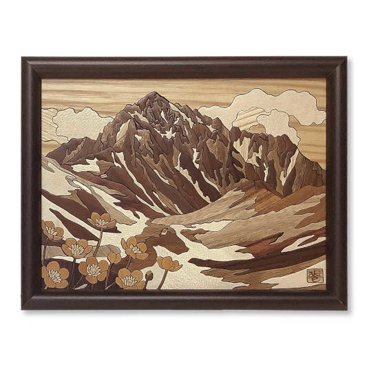 色々な種類の木をパズルのように組み合わせて、剱沢から望む剱岳を描きました。源次郎尾根や八ッ峰など岩尾根の緻密さと剱沢のおおらかさの対比が特徴です。
