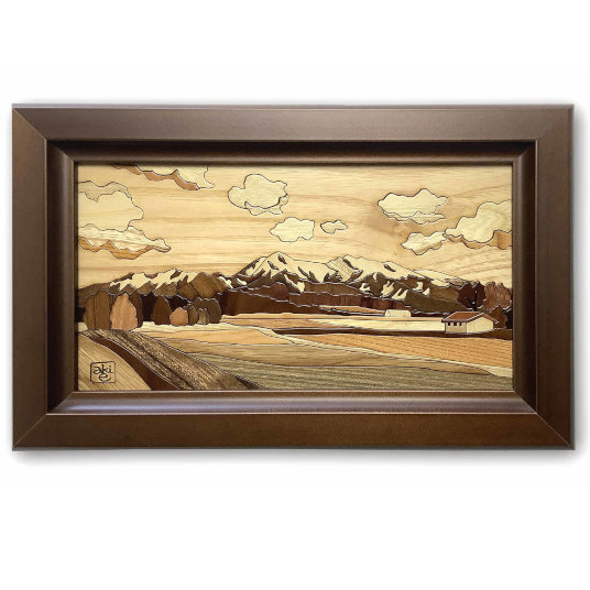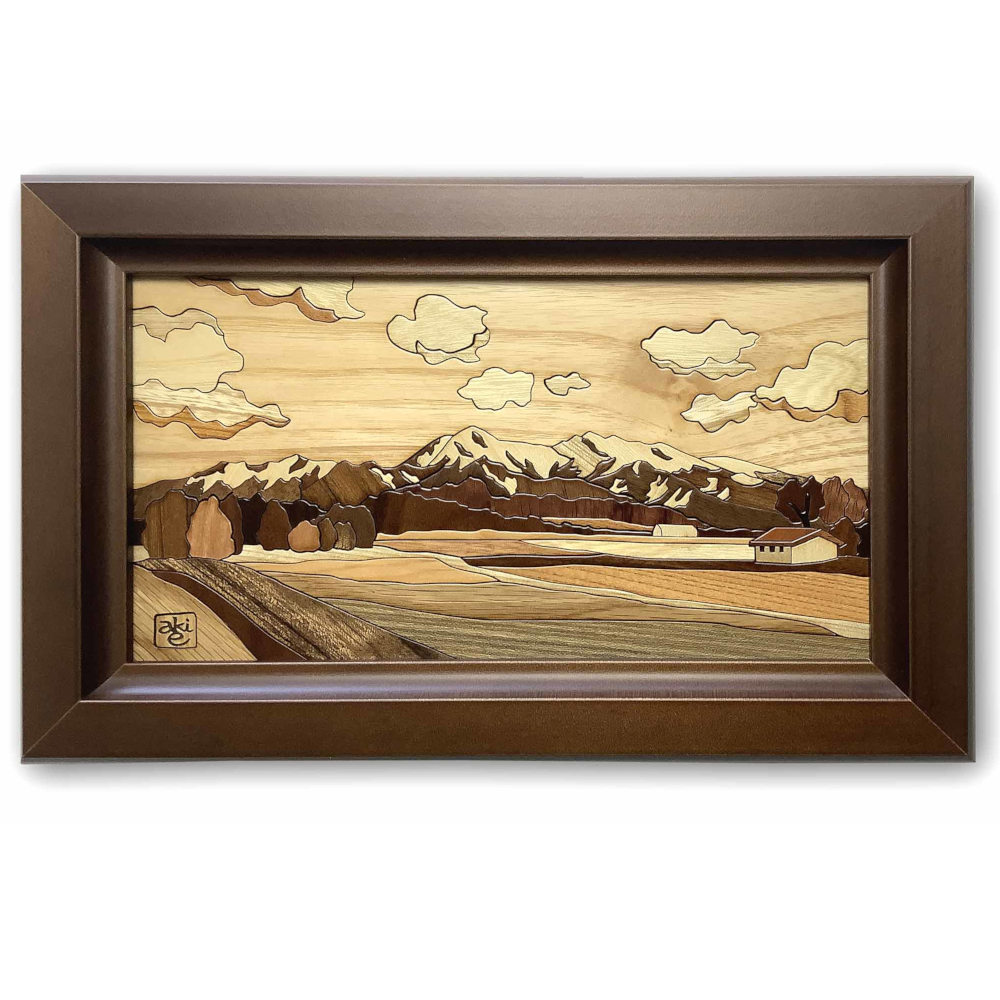 私たちが制作している、ウッドアートはヨーロッパの伝統美術であるマーケタリーの技法を改良した手法で私たちが20年かけて試行錯誤してきた技法です。基本は絵画ですが、単に木を当てはめただけではありません。色の選び方、木目の向きの決め方、限られた種類の色の中で全体の色のバランスの取り方、遠近感の出し方、光の表現など、ウッドアート独特の表現手法もあり、見飽きない作品です。山登りや自然が好きな夫婦がデザインから製作までやっています。私たちは現在は工房を山口県にも置き、妙高の工房と山口の工房を行き来して製作しています。木の風合いや温もりを生かした作品づくりを心がけています。