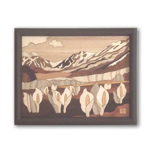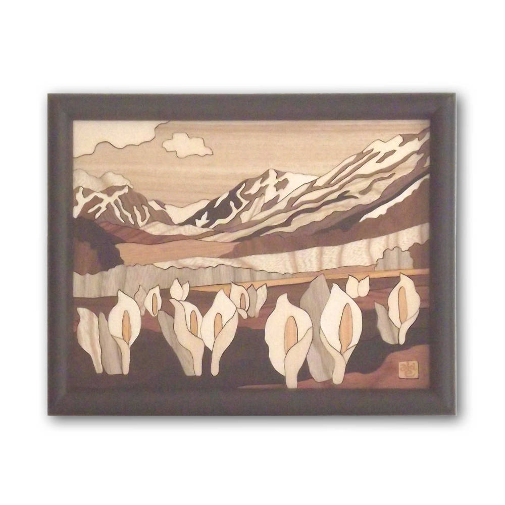 色々な種類の木をパズルのように組み合わせて、栂池自然園からの白馬連峰とミズバショウの水芭蕉を描きました。雪解けの進む初夏の白馬連峰。