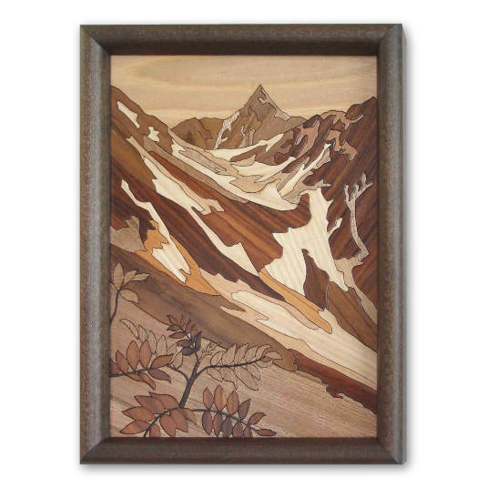 私たちが制作している、ウッドアートはヨーロッパの伝統美術であるマーケタリーの技法を改良した手法で私たちが20年かけて試行錯誤してきた技法です。基本は絵画ですが、単に木を当てはめただけではありません。色の選び方、木目の向きの決め方、限られた種類の色の中で全体の色のバランスの取り方、遠近感の出し方、光の表現など、ウッドアート独特の表現手法もあり、見飽きない作品です。山登りや自然が好きな夫婦がデザインから製作までやっています。私たちは現在は工房を山口県にも置き、妙高の工房と山口の工房を行き来して製作しています。木の風合いや温もりを生かした作品づくりを心がけています。