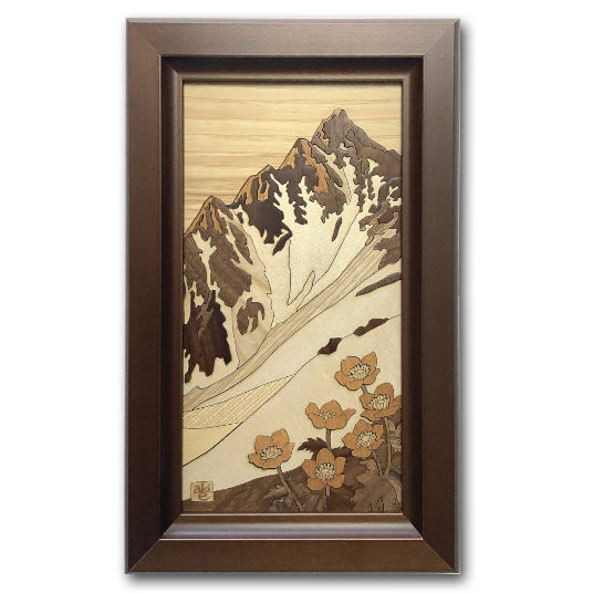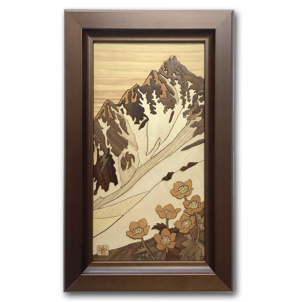 色々な種類の木をパズルのように組み合わせて、前穂高とシナノキンバイを描きました。北穂高への登高中の可憐な花との出会い。花と岩峰の組み合わせのアルペン的風景画。