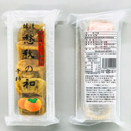 佐渡島南部の比較的温暖な圃場で栽培したおけさ柿を使用。原料の柿栽培から自社で一貫生産のため、安心・安全。一般的には食物繊維やβ-カロテンが豊富に含まれているとされ、美容や健康にも良いと言われる自然食品です。そのままでも格別の干し柿の甘さをご堪能頂けますが、薄切りにしてチーズに挟んだりと高級スイーツのような味わいがお楽しみいただけます。