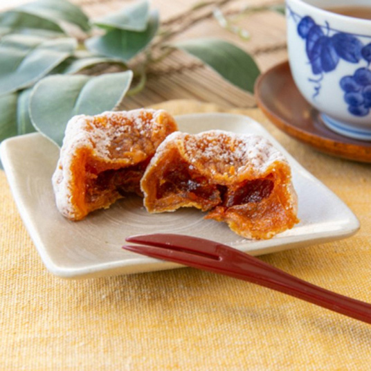 我々従業員が1年をかけて大切に栽培した柿を毎年10月頃に収穫。収穫した柿はある程度大きさ毎に分別した後自社工場内で皮むき、乾燥などの工程を経て佐渡島の名産の1つである「干柿」に仕上げます。柿の加工に使用する柿は佐渡島南部に位置する羽茂(はもち)地区の柿に限定しており、その食感はあんぽ柿とはまた違った歯ごたえしっかりの干し柿です。口いっぱいに広がる「濃厚な甘さ」は、まさに天然のスイーツです。