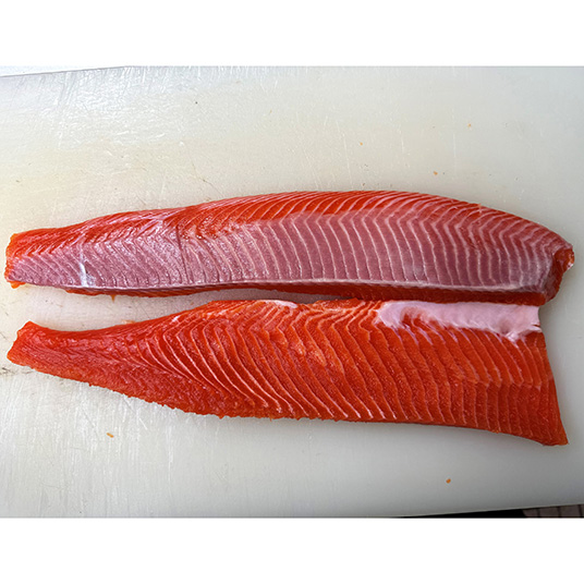 成分独自配合によるオリジナルペレットを与えることにより、従来のサーモンより脂を抑え、身のうまみが強くなります。また、「サーモンキラー」の異名を持ち、サーモンが食べられない方でも、おいしく召し上がれたというご意見を多数頂いています。