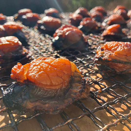 栄養豊富な対馬の海で養殖しているヒオウギ貝を山桜チップの煙でじっくり時間をかけて温燻にしました。味付けは、素材を活かすシンプルな対馬暖流を汲みあげた天日塩。山桜や炭の材料までも全て対馬産で、対馬に自生する山桜を切り、チップにするところから全工程を生産者が全て手作業で行なっています。