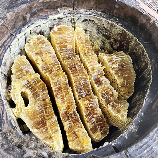 対馬は、西洋ミツバチがおらず、日本ミツバチしか生息しない島です。昔から蜂洞と呼ばれる手作りの巣箱で養蜂が行われています。多種多様な花から集められた自然のバランスが醸す濃厚な味わいの百花蜜です。蜂蜜を絞り出すところまで全て手作業で行っており、完全無添加、非加熱です。