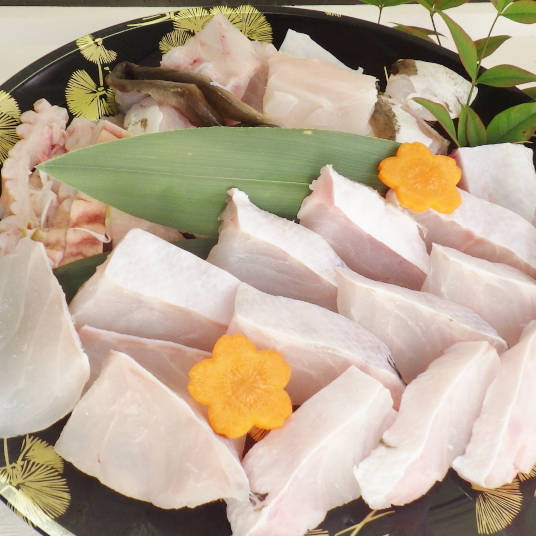 天然クエ鍋(身・あら)のセットです。野菜・薬味などは含まれません。 クセや臭味のない白身に加え脂がしっかり乗ってとにかくおいしいクエです。