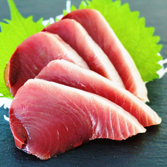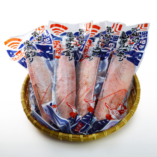 気仙沼船籍の遠洋一本釣りかつお船「亀洋丸」が、漁獲直後、船上で急速冷凍したとろかつおです。