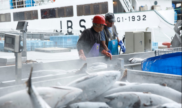 釣り上げられたカツオは冷凍状態のまま港まで運ばれ、そのまま水揚げされます。