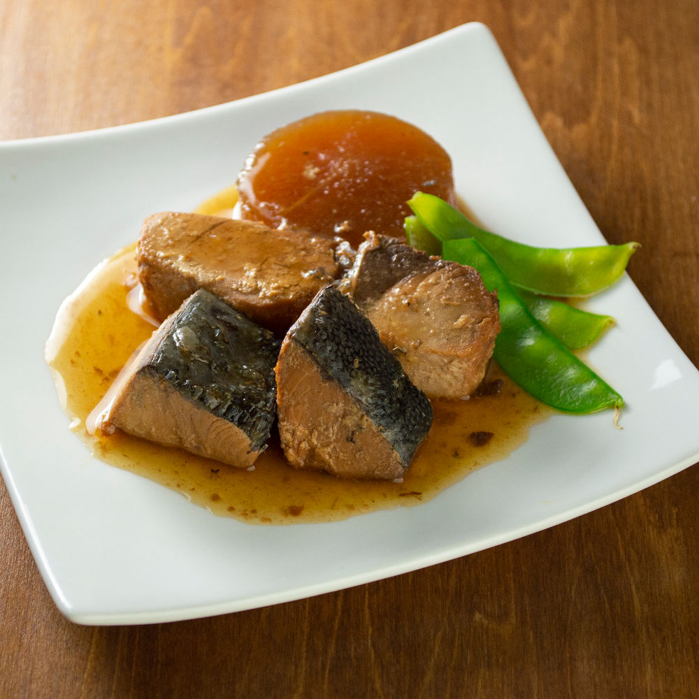 【ぶり大根】ぶり(国産)、大根、煮魚たれ(砂糖、しょうゆ、果糖ぶどう糖液糖、生姜、その他)、砂糖、醸造酢、風味調味料、コショウ/トレハロース、調味料(アミノ酸等)、酒精、増粘剤(加工でん粉、キサンタン)、カラメル色素、(一部に小麦・さば・大豆を含む)