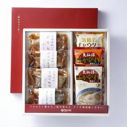 国産の良質な魚だけを使用した三陸海彩和風煮魚と、気仙沼特産であるふかひれを使ったわが社自慢のふかひれスープがひとつのギフトになっております。