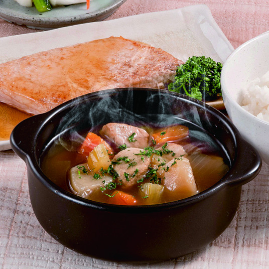 【 めかじき和風ポトフ 】野菜(じゃがいも、にんじん、たまねぎ、セロリ)(国産)、めかじき(宮城県産)、白ワイン、コンソメ粉末、しょうゆ、野菜ブイヨンパウダー、風味調味料、食塩、こしょう/トレハロース、増粘剤(加工でん粉)、酸味料