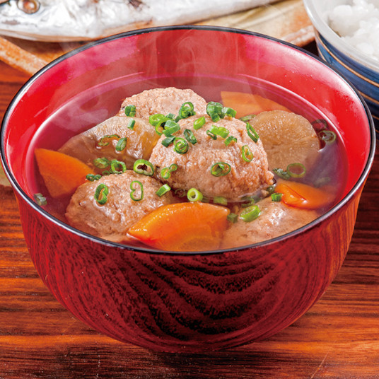 国産のかつお・さんま・メカジキと、国産野菜を使用した具だくさんの椀物です。