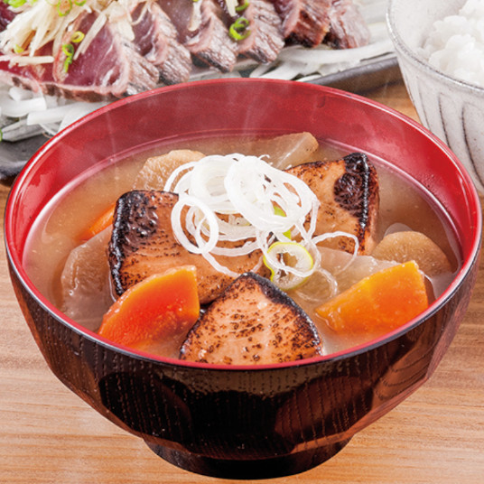 【素材】【炙りかつお汁】野菜(大根、ニンジン、ごぼう)、かつお(宮城県産)、味噌、酒、みりん、鰹節エキス、風味調味料、昆布エキス/トレハロース、増粘剤(加工でん粉)、調味料(アミノ酸等)、(一部にさば・大豆を含む)