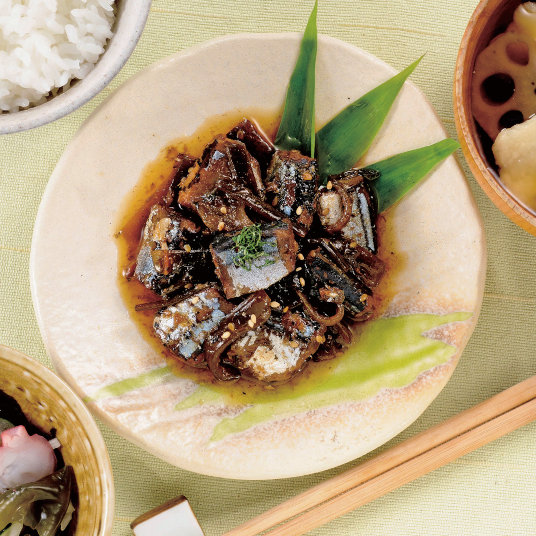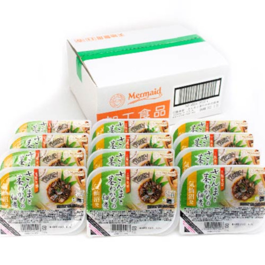 国産さんまと宮城県産の茎わかめを合わせて佃煮にしました。茎わかめのコリコリとした食感を残しつつ、さんまも骨までやわらかくて食べやすい!ごはんによく合う甘辛の味付けです。