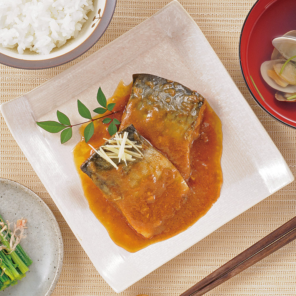【素材】さば(国産)、味噌だれ(味噌、砂糖)、砂糖、生姜、食塩、醸造酢、こんぶエキス/増粘剤(加工でん粉)、(一部にさば・大豆を含む)