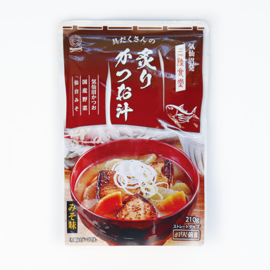 気仙沼に水揚げされたカツオと、国産野菜三種(大根、人参、ごぼう)を、大豆の旨みと深い香りをいかしたヤマカノ醸造「仙台味噌」で仕上げた『炙りかつお汁』です。