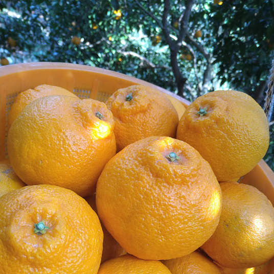 私たちが丹精込めて育てる柑橘は減農薬栽培と除草剤を使用せず有機質肥料と堆肥を施用し土づくりを意識して生産しています。豊な芳香を持ち糖度が高く、程よい酸味で濃厚かつジューシーな果実です。果皮は少し厚いですが、剥きやすく、じょうのう膜(房の袋)が薄く種もほどんどないのが特徴です。その中でもM~2Lサイズを混合しています。