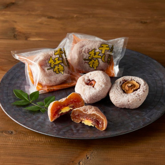 山形県上山市にしかない紅干し柿。約300年の歴史のある上山原産の紅干し柿は冠雪の山々から吹き降ろす冷たい風と日中の柔らかい日差しにより濃厚な甘みの干柿になります。『和菓子の甘さは干し柿の甘さをもって最上とする』とも言われています。収穫から約1か月の期間を、17の工程(ほとんどが手作業)を経て生産されます。じっくりと時間をかけて出来上がった天然の何も足さない和のスイーツです。