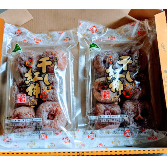 山形県上山市にしかない紅干し柿。約300年の歴史のある上山原産の紅干し柿は冠雪の山々から吹き降ろす冷たい風と日中の柔らかい日差しにより濃厚な甘みの干柿になります。『和菓子の甘さは干し柿の甘さをもって最上とする』とも言われています。収穫から約1か月の期間を、17の工程(ほとんどが手作業)を経て生産されます。じっくりと時間をかけて出来上がった天然の何も足さない和のスイーツです。