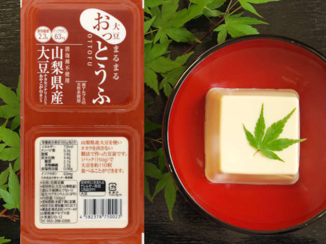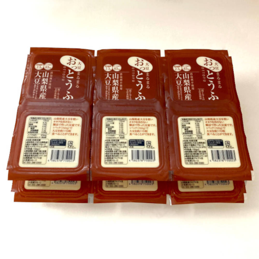 山梨県産大豆を使用し、オカラを出さない製法で南アルプスの水と尾鷲の海洋深層水にがりで仕立てました。1パック(150g)当たり、約110粒の大豆をまるごと使い、栄養価も高く、大豆本来の甘みを存分に引き出した、おっと驚く濃厚なお豆冨です。