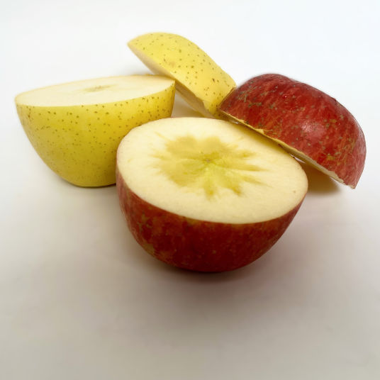 「サンふじ」は酸味と甘みのバランスが良く、コクのあるまろやかさと果汁たっぷりのジューシーさが特徴です。2つのお味をお楽しみください。