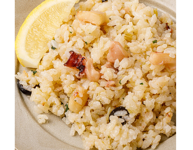 【素材】うるち米(秋田県産)、たこ(秋田県産)、たまねぎ、レモン、セロリ、オリーブオイル、オリーブ、にんにく、パセリ、塩、こしょう/色調安定剤(グルコン酸第一鉄)
