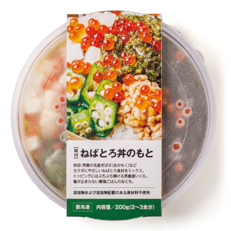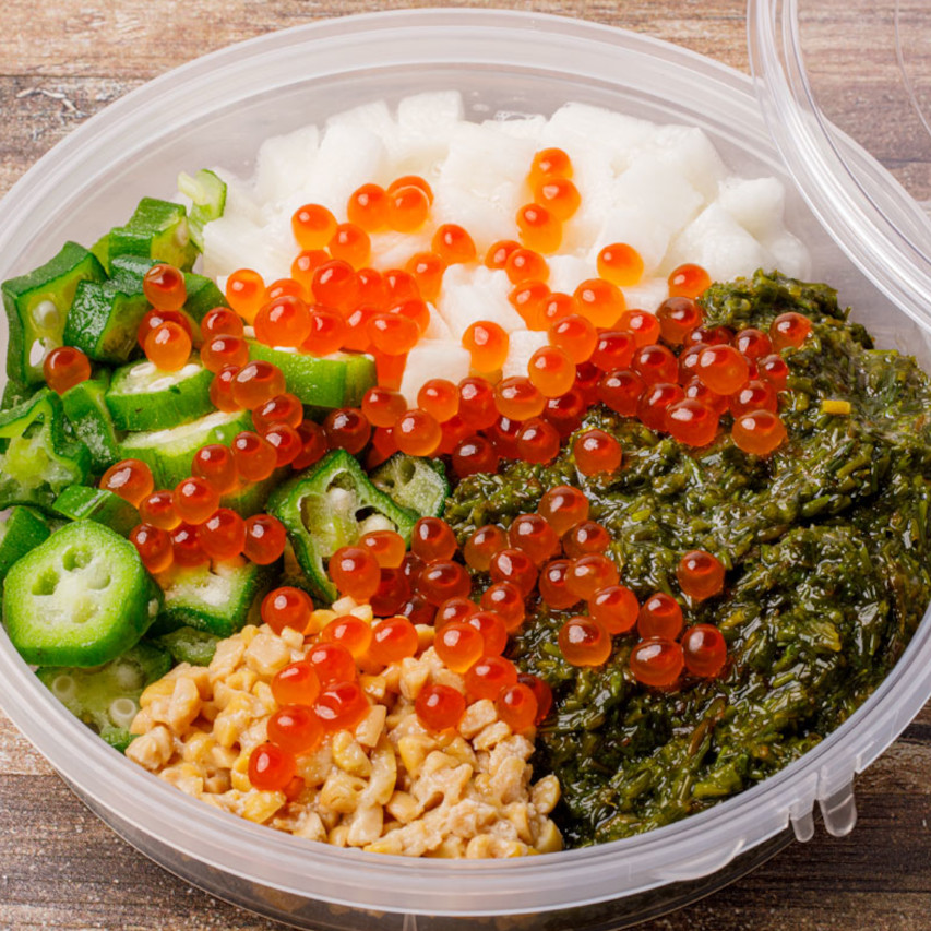【素材】あかもく(秋田県産)、ながいも、たれ(醤油、清酒、みりん、和風だしの素)、おくら、いくら、納豆(大豆、納豆菌、食塩)、(一部に小麦・大豆・いくら・やまいもを含む)