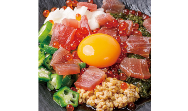 "いまや秋田・男鹿の特産のひとつとなった「ぎばさ(あかもく)」をベースに、おくら、納豆、ながいもなどのカラダにやさしいねばとろ食材をミックス。さらに、ぷちぷち弾ける男鹿産いくら醤油漬けをトッピングしました。
