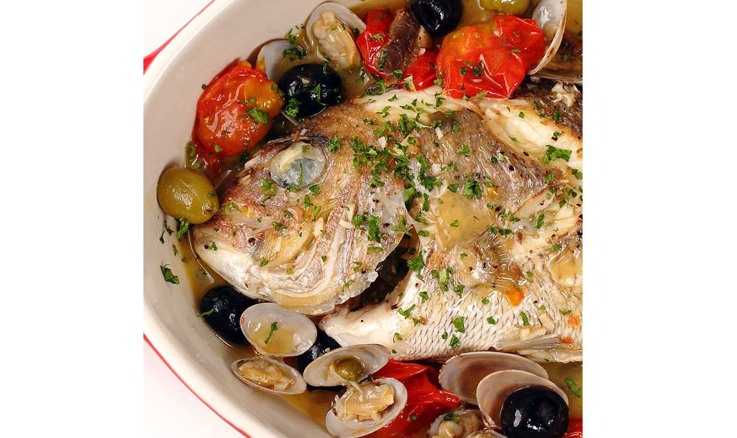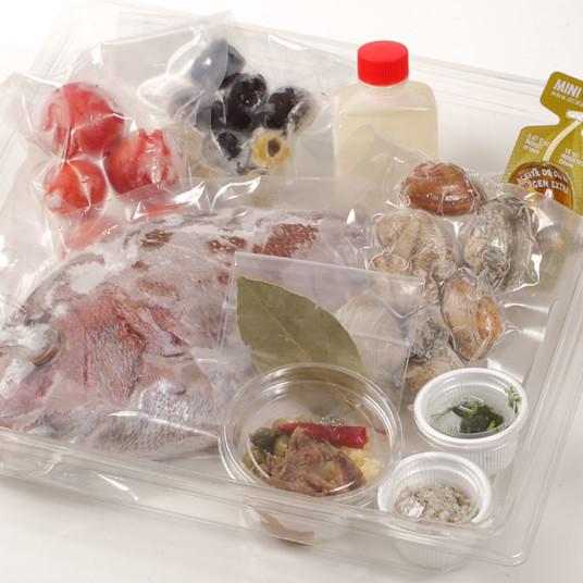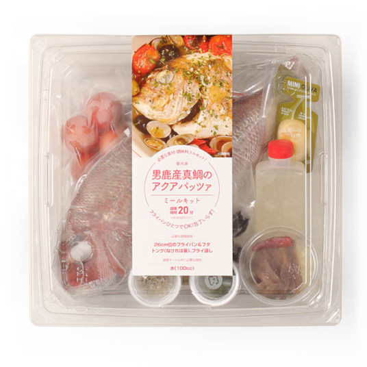 【素材】真鯛(秋田県産)、ミニトマト、あさり、白ワイン、オリーブオイル、オリーブ(黒)、オリーブ(緑)、アンチョビ、にんにく、ケーパー、パセリ、食塩、唐辛子、こしょう、ローリエ、ローズマリー、タイム/色調安定剤(グルコン酸第一鉄)