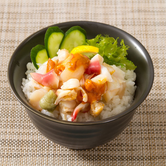 海鮮丼には、ワサビやネギなどの薬味で。
