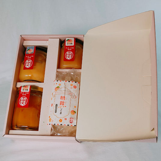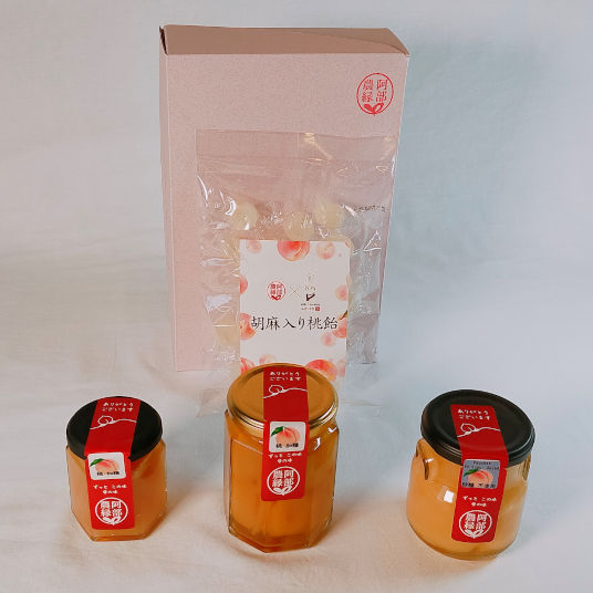 【内容量】桃のコンポート(加糖) 200g 、桃のコンポート(砂糖不使用) 200g 、桃のコンフィチュール 100g、胡麻入り桃飴 100g