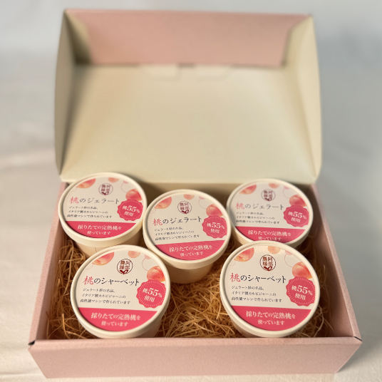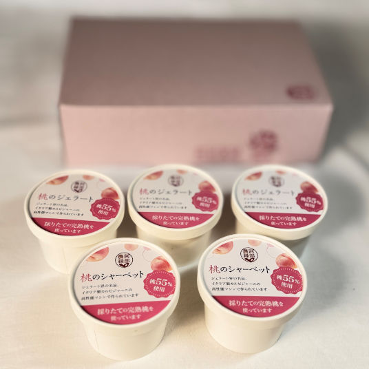 【内容量】桃のジェラート 120ml×3個、桃のシャーベット 120ml×2個