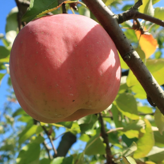 減農薬りんご。太陽をいっぱい浴びて、栄養と旨みを葉っぱから沢山吸収した「葉とらずりんご」です。手塩にかけた、自慢のりんごです!! シャキシャキ!甘みと酸味のバランス良好。たまに蜜入りのものもでます。是非ご賞味ください!!