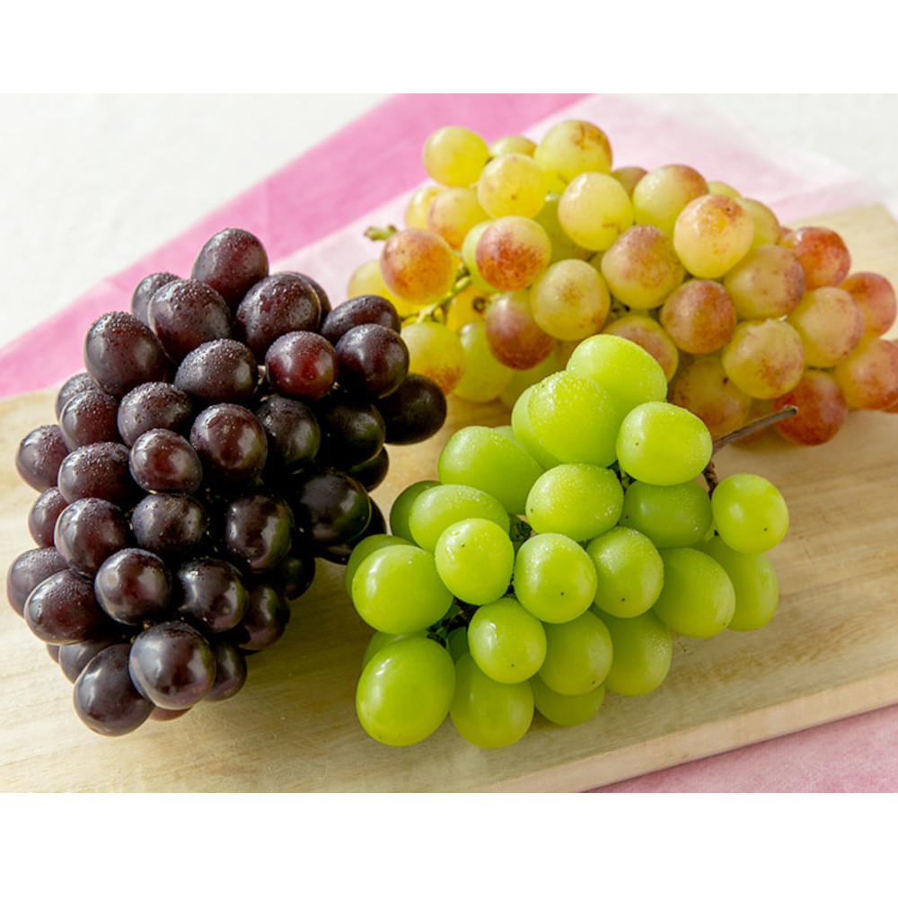 皮ごと食べられる品種の緑色(シャインマスカット)赤(紅たまき等)黒(マスカットノワール等)の3種のセットです。それぞれ見た目も違いますが、香りも食味も違うのでバラエティーに富んだ楽しみ方を味わえます。