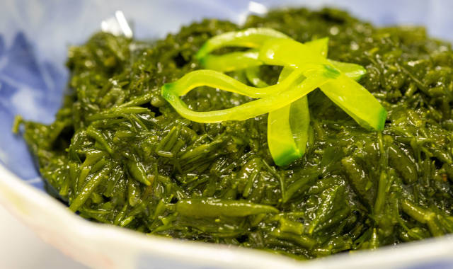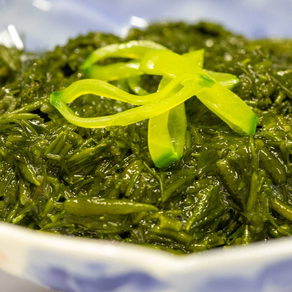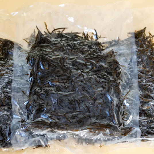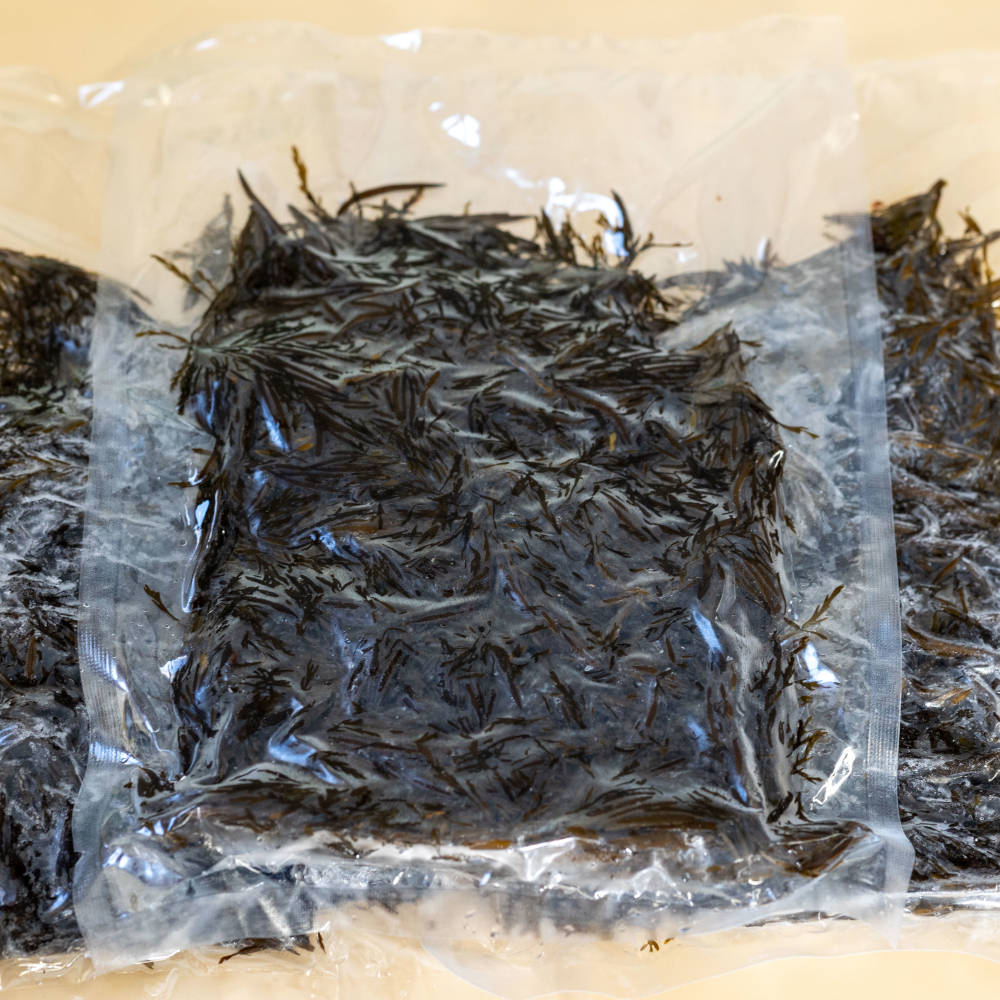 山口県は、春の桜が咲くとアカモクの収穫が最盛期になります。天然のアカモクの硬い茎から柔らかい部位を取り分けて、袋詰めして真空冷凍で保存するので解凍しても新鮮です。