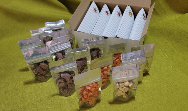 すべての食材を地元産に限定し、ほとんどの過程が手作りのため、生産者の顔が見える安心安全なヒューマングレードの商品です。ワンちゃんだけでなく、人間用にも。軽量で携帯が容易なため野外や登山時のお料理の材料など幅広い使用方法があります。