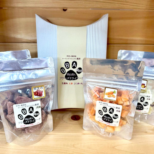 GBA Wan 岡山育ち ペットと一緒に食べれる 鹿肉10g×2袋、さつまいも10g×1袋、にんじん5g×1袋をセットにしました。鹿肉以外は加熱しなくても、食べれる為、ペット用のおやつや子供さん向けのおやつにもおすすめ。手軽で、長期保存が可能な為、備蓄食としても可能です。