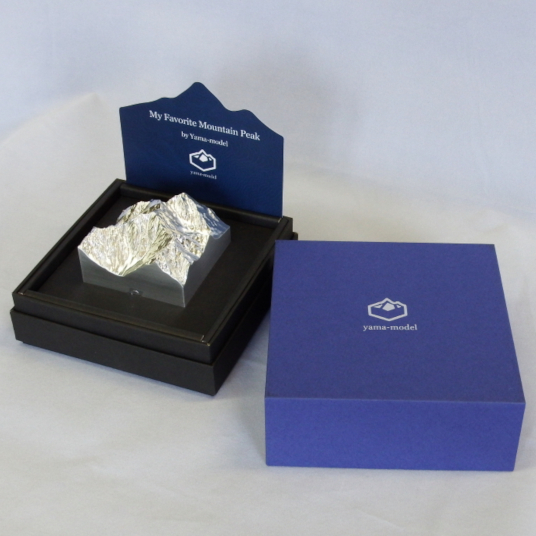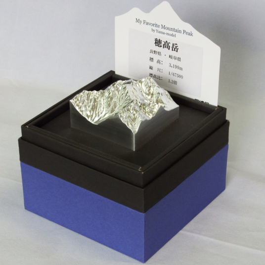 山岳金属模型「山モデル」はデジタル標高データ(数値地図)を用いて、金属を加工するマシニングセンタという数値制御(NC)機械で立体的な3次元切削加工をして製作します。また山は遠くから見るのと近くから見るのとでは山容がまるで違って見えてしまいます、そこで高さの強調を行うことによって個々の山の素晴らしさをお届けいたします。