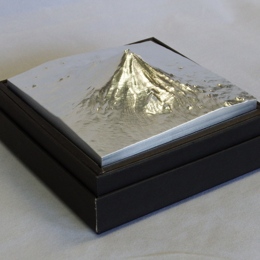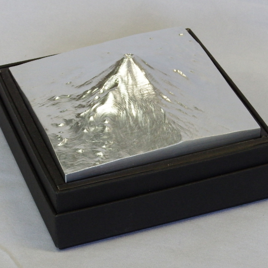 山岳金属模型「山モデル」はデジタル標高データ(数値地図)を用いて、金属を加工するマシニングセンタという数値制御(NC)機械で立体的な3次元切削加工をして製作します。また山は遠くから見るのと近くから見るのとでは山容がまるで違って見えてしまいます、そこで高さの強調を行うことによって個々の山の素晴らしさをお届けいたします。