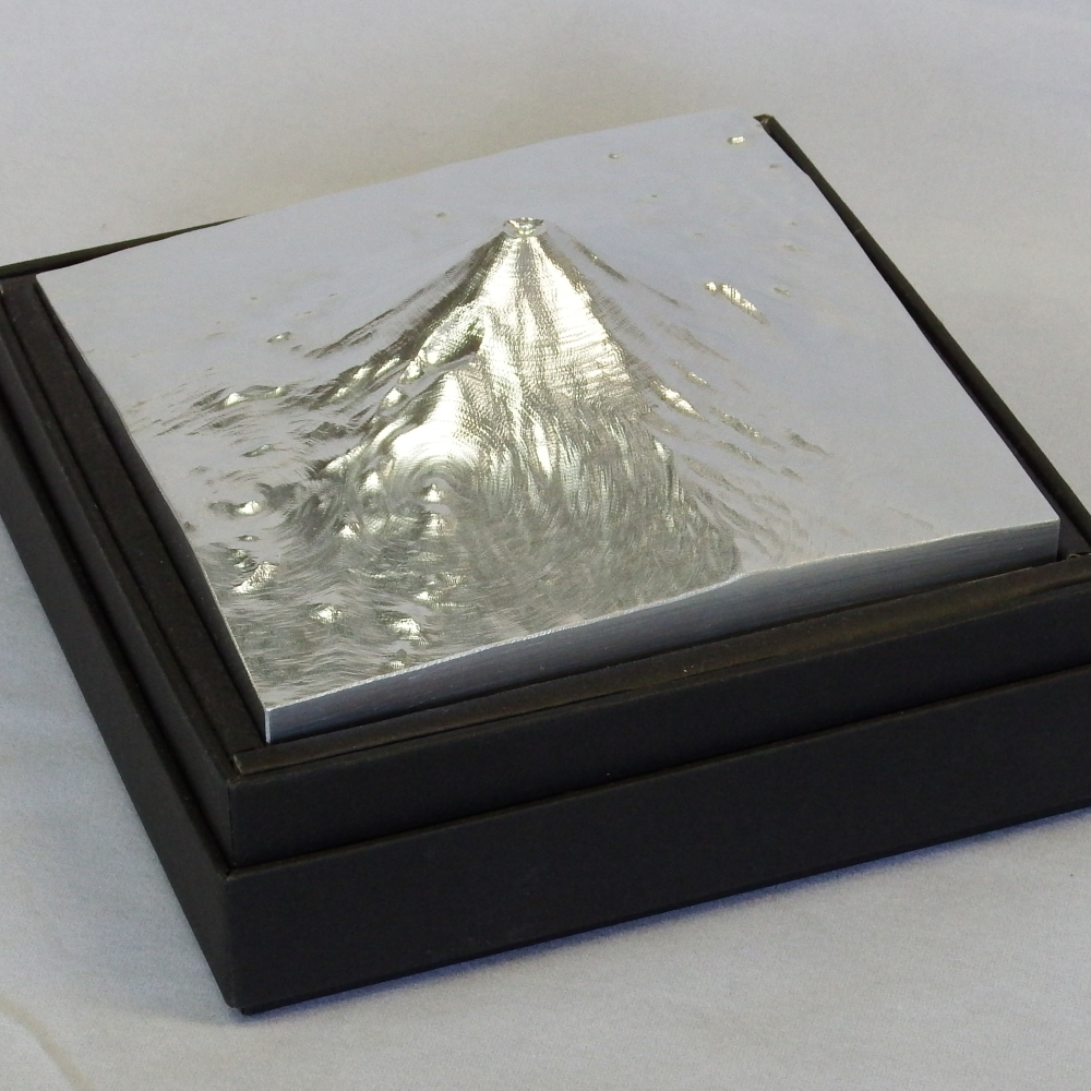 日本を象徴する富士山の「美しさ」「雄大さ」をこのサイズで製作しました。また独立峰の美しさを表現するために等高線切削加工で仕上げてあります。