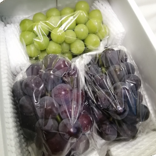 基本の組み合わせはシャインマスカット1房&ピオーネ2房、計3房の組み合わせ。収穫状況により4房、5房詰めになる可能性もあります。異常気象の影響などで、品種構成が変更する可能性があります。