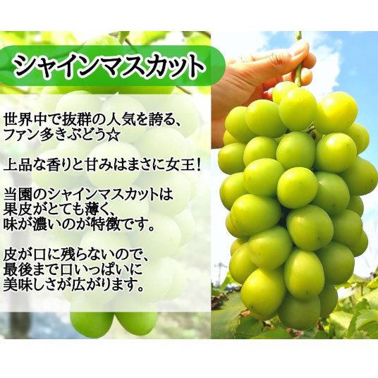 見た目も味わいも格別こだわったシャインマスカットで、当園最高峰のぶどうです。